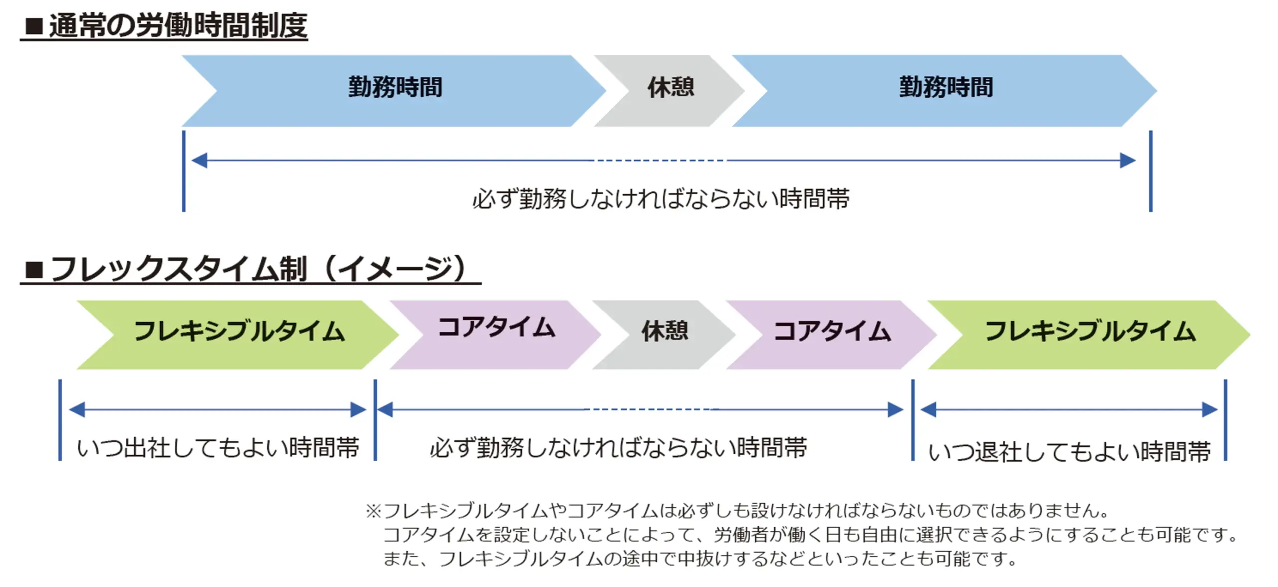 | 5 | コアタイム | 労働者が1日のうち必ず働かなければならない時間帯 | 任意 |
