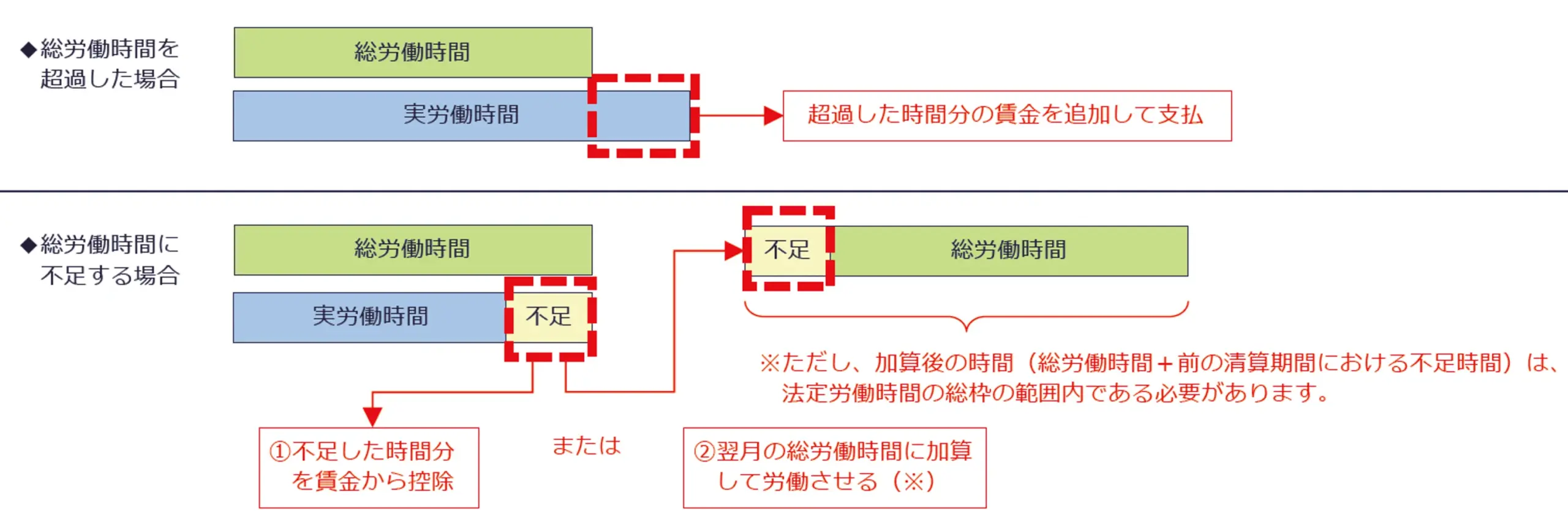 ただし、加算後の時間(総労働時間+前の清算期間における不足時間)は、法定労働時間の総枠の範囲内におさめなければなりません。ここまで解説した内容をまとめると、厚生労働省が示す以下の図のとおりになります。