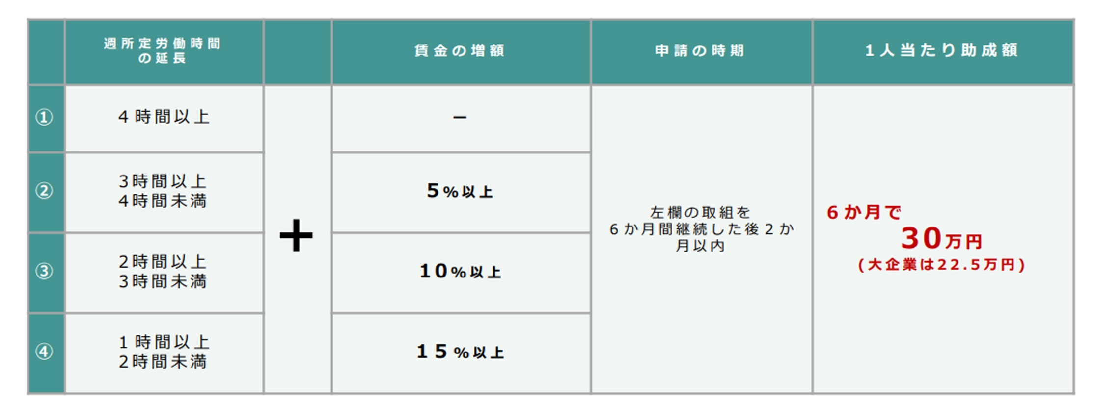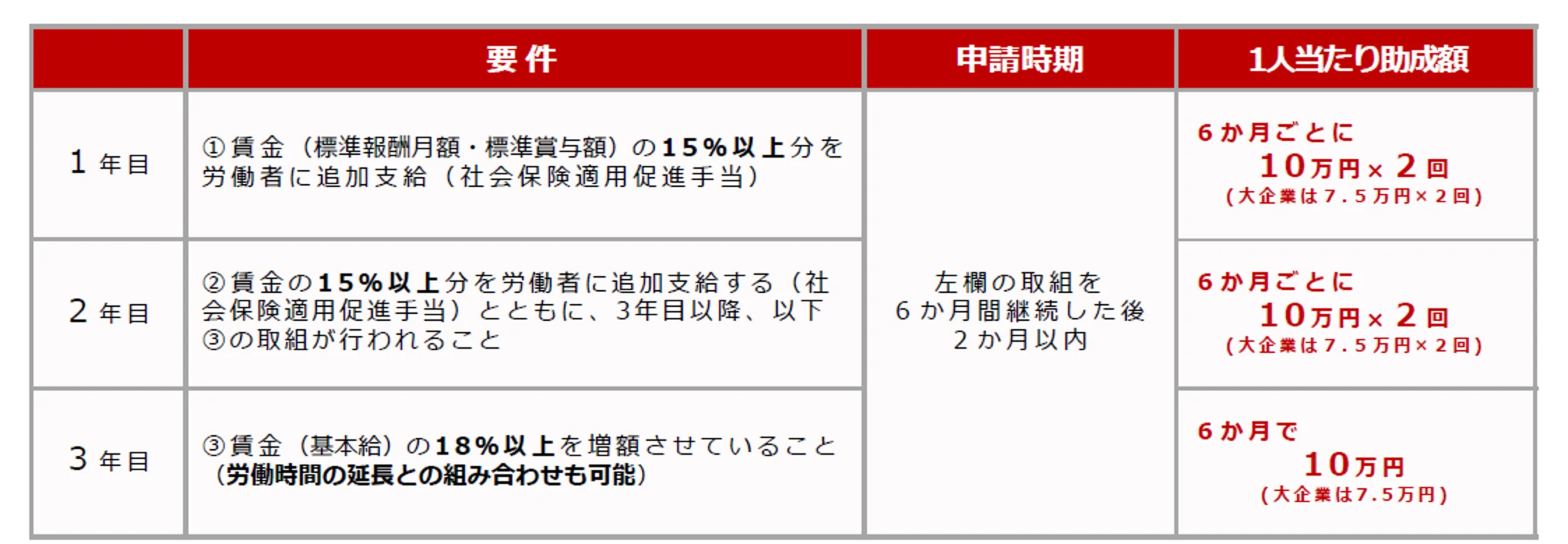 これに対して「(1)手当等支給メニュー」の3年目では“6ヵ月で10万円(大企業は7.5万円)”になります。